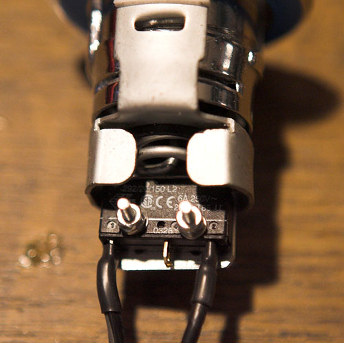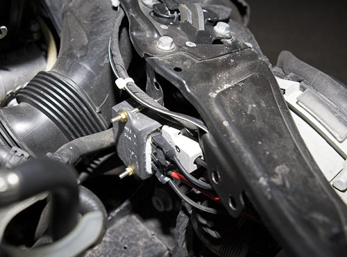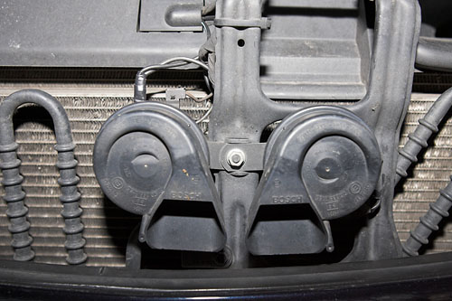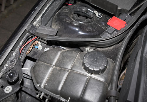 Ebenso unspektakulär der Masseanschluss neben dem Ausgleichsbehälter, und der Anschluss der beiden Signalhörner. Vielleicht umwickel ich das noch mit Isolierband. Freuen wirds alle Originalitäts-Fanatiker, es ist nämlich alles spurlos wieder rückrüstbar. Und zum Abschluss gibts noch ein kleines Video wie sich die Anlage in der Praxis macht. Alarmvideo (1 MB AVI-Format)