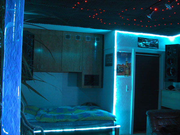 | Links im Bild erkennt man eine der beiden 2m hohen Wassersäulen die ich mir vor langer Zeit mal gebaut habe, an der Decke eine selbst gelötete Lichterkette aus Leuchtdioden die an dem Akustikschaumstoff befestigt ist. Weiterhin gibts noch den blauen Lichtschlauch welchern ich an der Decke ringsherum verlegt habe, nur vorm Bett gehts untenherum. Das ist eine sehr stimmungsvolle Beleuchtung, nicht optimal zum Filme schauen, aber in Sachen Frauen äusserst wirksam. ;-) | |||||||||||||||||||||||||||