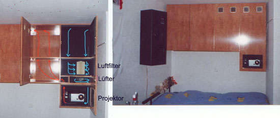 | Ein etwas älteres Foto (noch keine Vorhänge an den Wänden und kein Schaumstoff an der Decke) von meinem Projektorschrank. Dieser hat die Funktion den lauten projektor unhörbar zu machen und diesen auch vor Staub zu schützen. Blaue Pfeile symbolisieren wie die kalte Luft oben eingesaugt wird, und durch das erste Schrankfach zum LKW-Luftfilter kommt. Direkt darunter sitzt ein 50Watt Radiallüfter der einen gewaltigen Luftdurchsatz erzeugt. Die um 13°C erwärmte Luft wird dann wieder durch verschiedene Fächer nach aussen geleitet. Ein Restgeräuch ist immernoch vorhanden, dieses kommt von dem stakren Lüfter und den Luftströmungen, aber dieses dumpfe Grollen nimmt man schon nach ein par Sekunden Film nichtmehr richtig wahr. | |||||||||||||||||||||||||||