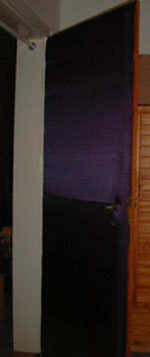 Tür: Mit Akustikschaumstoff beklebt und dann mit dem selben Stoff aus dem die Vorhänge sind bespannt. |