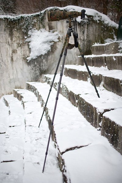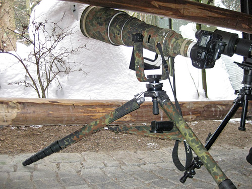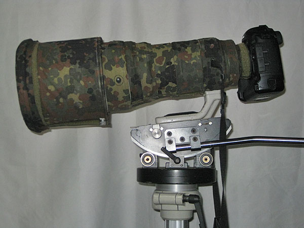 Mit dem 400mm 2,8 darauf stimmt der Schwerpunkt fast perfekt. Leider verhindern das Gewicht von 13,3kg und die Unhandlichkeit den mobilen Einsatz dieses Statives. |