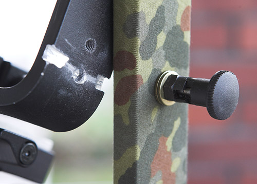 Arretierung für den Bügel, realisiert mit einem Federbolzen. Man