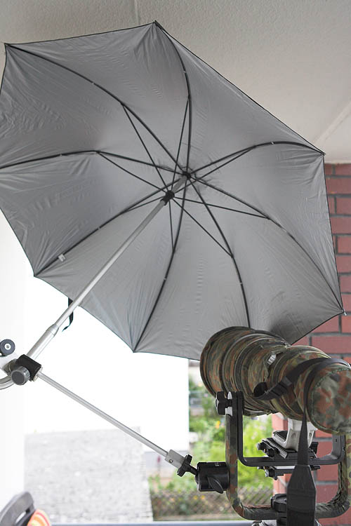 Meine Hauptanwendung ist allerdings der Regenschirm hier. Und so ganz Nebenbei dient der auch noch als Regenschutz wenn es sein muss. Die Verlängerungsstange ist selbst gebaut. |