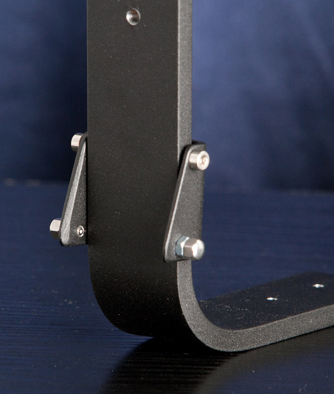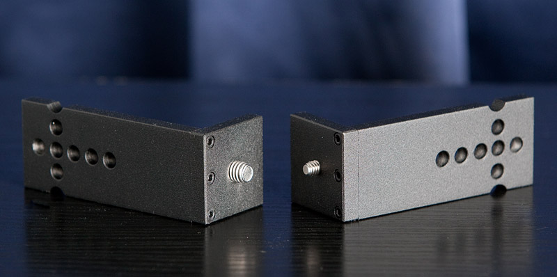 Die Arretierung alleine war mir aber noch nicht genug Innovation. Oft habe ich festgestellt, dass man Zubehör irgendwo am Stativ befestigen können müsste, aber es gab da keine geeigneten Anschraub-möglichkeiten. Daher habe ich bei Bedarf montierbare Winkelplattformen gebaut. |