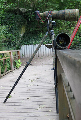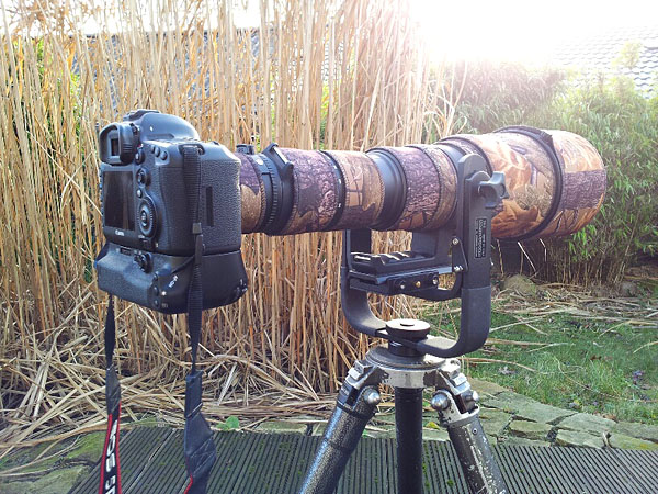 Es gibt da einen schönen Stativkopf von Manfrotto. Obwohl Manfrotto nicht gerade zu den besseren Herstellern von Köpfen gehört bietet der 393 ein sehr gutes Preis/Leistungsverhältnis. (Allerdings hat das der Hersteller auch schon gemerkt und er kostet inzwischen schon 160€, ich hatte ihn damals noch für 120€ bekommen) Dieser Kopf ist an sich perfekt für Objektive wie das 100-400L oder das 300 2,8L, ein echter Geheimtip. Aber er trägt auchnoch ganz gut das 600er. Allerdings wollte ich den Kopf noch etwas fester haben, und so wurden seitlich Versteifungen angeschraubt, siehe Foto. |