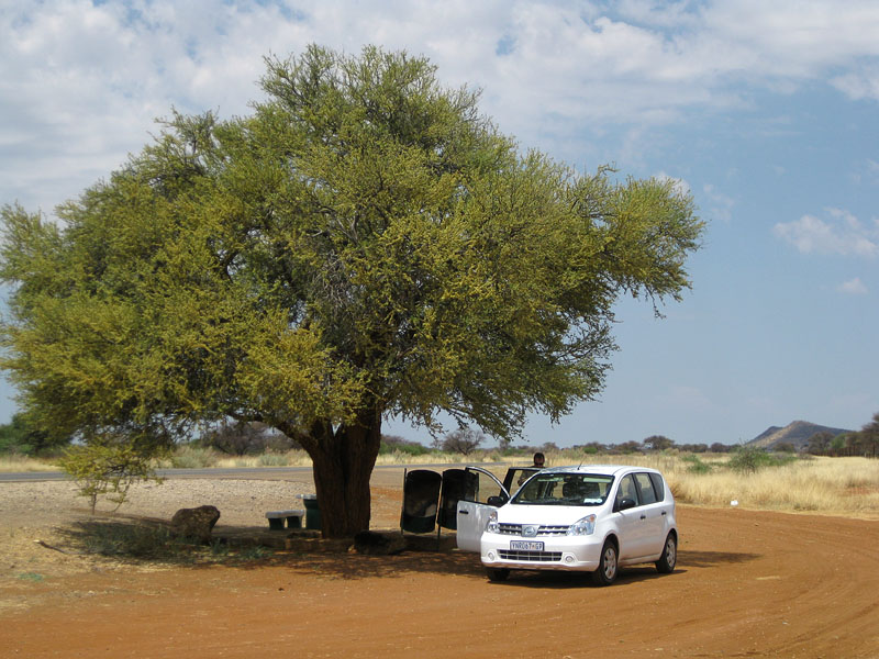 Africa. Im Flughafengebäude brüten Vögel, die Passkontrollen dauerten ewig und es mussten die ersten bescheuerten Papiere ausgefüllt werden. Eigentlich sollten wir von jemand vom Reisebüro empfangen werden und gleich das Mietauto bekommen. Aber wie gesagt, T.I.A. und niemand war da. Zum Glück hatte diese Autovermietung einen Schalter im Flughafen und sie mussten uns dann nach Windhoek fahren weil dort das Auto sein sollte (der Flughafen liegt 35km ausserhalb). Unser Auto war aber nicht da - wir bekamen ein anderes. Trotz bereits abgeschlossener Superversicherung in der alles drin sein sollte erklärte man uns vor Ort, dass Glas- und Unterbodenschäden nicht versichert sind. Also rate ich von der Thrifty Autovermietung ab. Bei "Kea" sollte das kein Problem sein wurde uns gesagt. Dann tauchte doch noch unsere lokale Ansprechpartnerin auf und erzählte uns was ich eh schon wusste. Ich hatte mich ja vorbereitet, und die Route kannte ich schon auswendig. Im Supermarkt gegenüber deckten wir uns mir reichlich Wasser und Keksen für die Tage im Auto ein. Die Preise waren etwas günstiger als in Deutschland, aber nicht übermässig viel. Erstaunlich war das Warenangebot, es gibt dort sehr viele Sachen die es auch in Deutschland gibt, man fühlt sich fast wie zu Hause. |